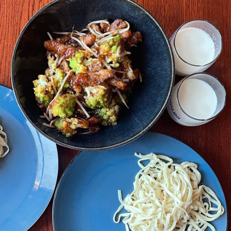 Verwarm wat zonnebloemolie in een pan en bak de knoflook, gember en rode peper zo’n 2 minuten. Daarna nog de romanesco zo’n 4 á 5 min. meebakken. Voeg de sojasaus en de bruine suiker toe. Vervolgens kan het maïzena mengsel toegevoegd worden samen met het vlees en bak dit nog zo’n 4 á 5 min mee. Roer tot slot de taugé er doorheen. Serveer de noedels en het vlees apart.